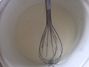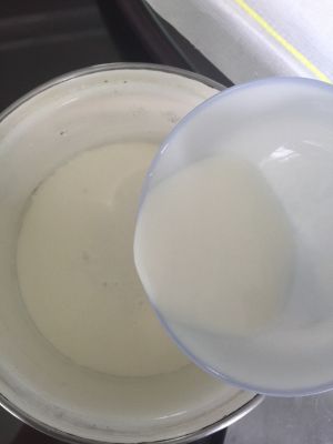 淡奶油、牛奶、白糖倒入容器内,边加热边搅拌,待白糖全部融化,端离炉火,冷却。