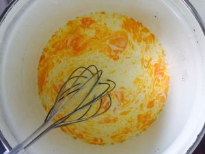 待奶油与牛奶混合液放凉后,假如蛋黄搅匀。