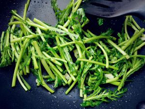 再下叶子,快炒至变色,下盐和少许生抽,炒匀即可