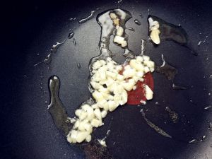 大蒜切片,放入油锅爆香后加辣椒炒,放少许盐。