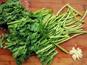茼蒿洗净,沥净水份,切段。大蒜用刀背拍扁,去皮,切碎