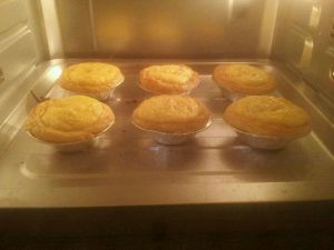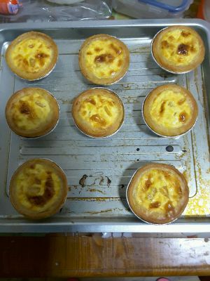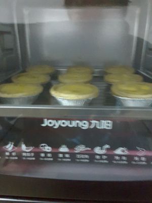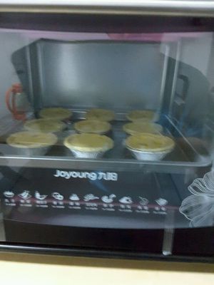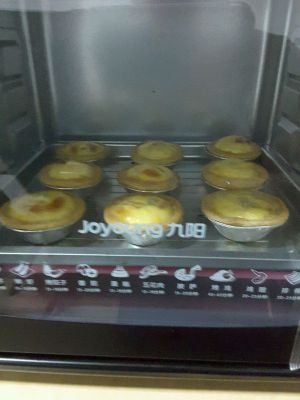 3、烤箱220度预热5-10分钟,将蛋挞液均分到蛋挞皮里,基本个个7/8分满,放入烤箱220度烤20分钟即可,喜欢吃虎皮斑的宝宝也可以把托盘放到最上层烤几分钟上个色