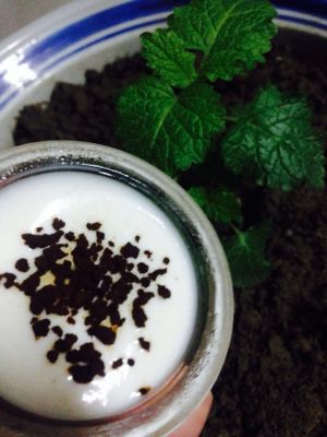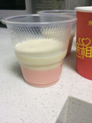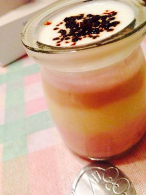 倒入一层冷冻,再倒另外一层。牛奶中加入吉利片就是白色那层啦。最后咖啡撒上。