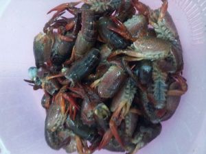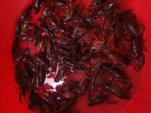 小龙虾洗干净,青红椒切断,蒜泥50克小火炸香炸干备用