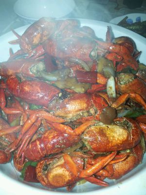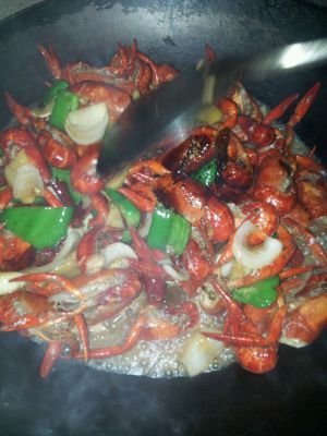 蒜油下姜片小龙虾炒香,放盐,耗油,生抽,糖继续翻炒,加水演过龙虾煮20分钟,收汁前下辣椒段和蒜渣和鸡精翻炒30秒起锅