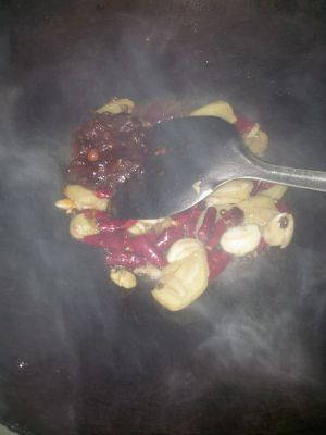 之前炒虾有很多油,直接留下了底油就炒香料吧,生姜蒜子,两勺豆瓣酱,花椒一点点