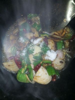 青椒洋葱也都下去吧,放点盐和鸡精,豆瓣酱很咸,所以根据自己的口味放盐哦,加点开水烧汤