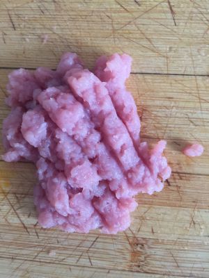 瘦猪肉用刀背剁碎,最好成小颗粒。