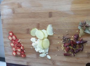 姜蒜,干辣椒,花椒,八角,香叶,小红椒备好,怕辣的可以少放点辣椒或者不放。
