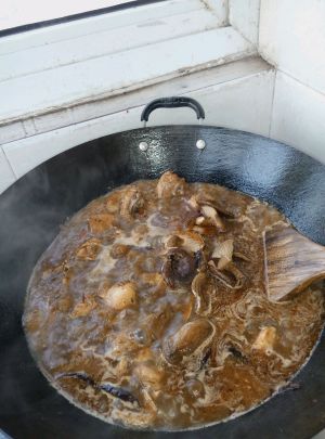 加入开水没过鸡肉,放入香菇,转小火炖。