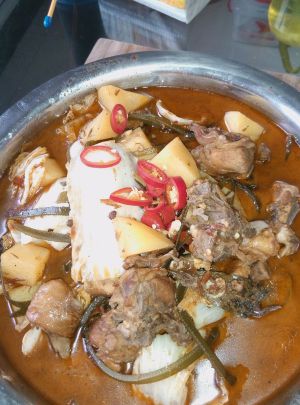 半小时后加入土豆,土豆炖软了放入海带,白菜,熟后撒点鸡精,出锅。喜欢其他蔬菜也可以随意加。慢慢享用吧,超级美味。