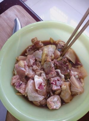 公鸡斩块,洗净,用料酒、少许盐、生抽、姜腌制两个小时。