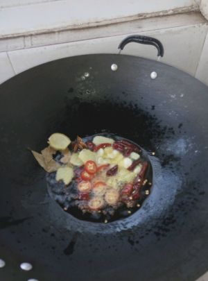 炒至没有水分,加入豆瓣酱,花椒,干辣椒,贵皮,香叶,八角,酱油,糖,炒出香味