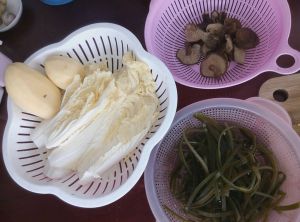 香菇提前泡发,准备喜欢的蔬菜,我喜欢海带,土豆,冰箱还有白菜,就我和老公两个,够了。