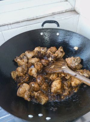 放入鸡肉炒干水分,再放入烧鸡公调料包一起翻炒。