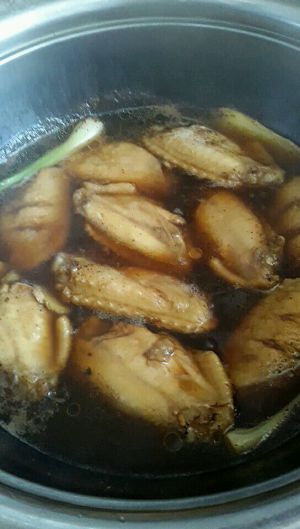 鸡翅表面略微有点金黄加生抽,老抽,冰糖和适量开水,加盖焖大约十分钟