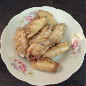 鸡翅用水煮熟后用冷水洗去血水,划开,倒入料酒和生姜腌制几分钟(用东西盖起来腌制会更入味)