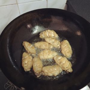 第七步: 油温升至七成再将鸡翅放入复炸
