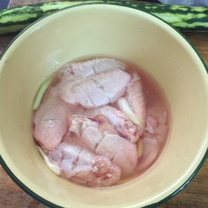 第三步: 将盐、味精、胡椒粉、白酒、姜片、鸡翅放入水中腌制30min