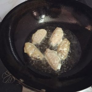 第五步: 锅中倒入油(四至五成热),将撒好粉的鸡翅一个一个鸡翅放入