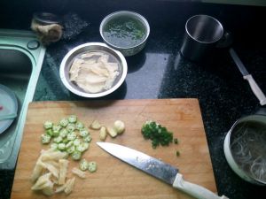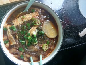 煮开以后,粉丝下锅,还有各种吃的,比如我放的是,腐竹,土豆,秋葵。