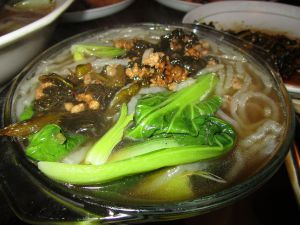 将泡好的粉再放进开水里煮至耙软 捞出再煮青菜 然后将汤汁浇到粉上, 加花生黄豆葱花和少许红油