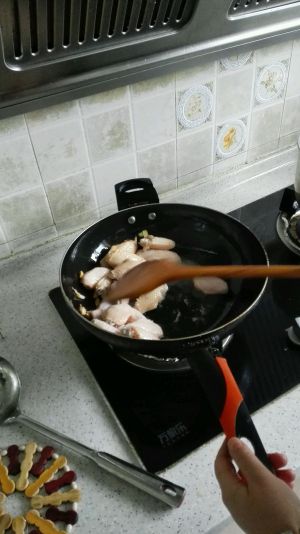 腌制好后,将鸡翅放入热油锅中翻炒,至金黄,随后加入葱,姜。