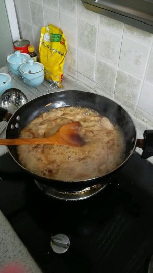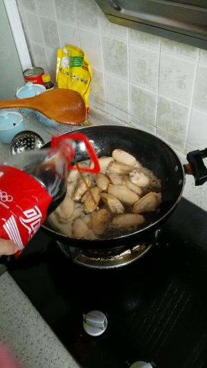 之后倒入可乐。熬到可乐没有。当中可乐气泡要弄掉。放入适量酱油料酒还有鸡精