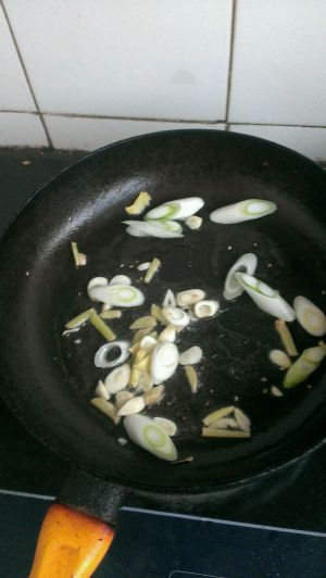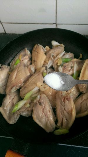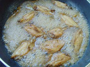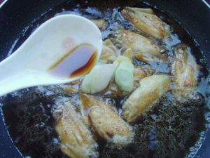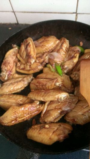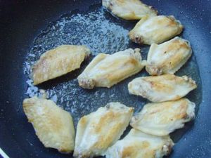 放少许油,八角两瓣,葱花炝锅,放入鸡翅煎炸(鸡翅腌渍后用清水清洗)。
