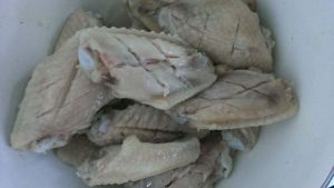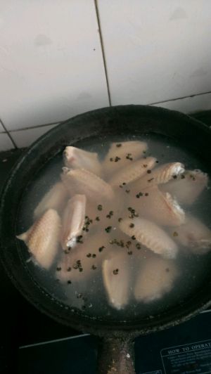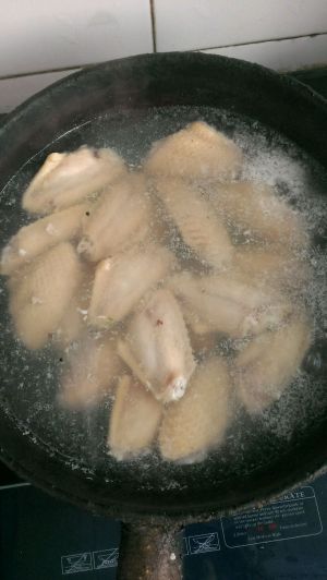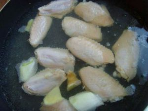 鸡翅洗净,入姜水中煮沸捞出,沥干水分。