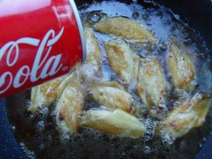 待鸡翅煎炸成两面金黄后,放入切好姜片翻炒,约30秒后倒入可乐,放入少许老抽,少许盐、糖。中火盖锅盖闷煮10分钟左右。(可乐放入量以覆盖鸡翅为宜,闷煮时间以可乐量为宜,最佳时间为汤汁较少。)