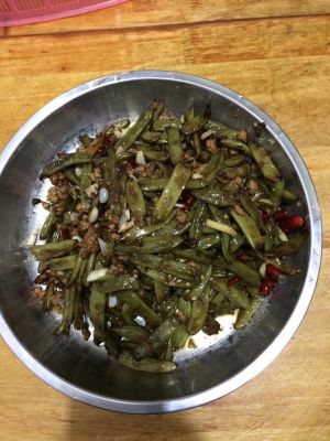四季豆去筋 折五厘米左右小段 洗净沥干水待用,两面筋一定去干净不然吃起来口感不爽,起锅放油 油七成热 放四季豆煸炒 炒至四季豆表皮褶皱 一点金黄色 就可以了!炒好的四季豆盛出,留锅底油 加入五花肉沫,五花肉要剁碎成饺子馅一样,五花肉沫炒熟 下姜 葱 红椒 翻炒爆香 炒好下煸好的四季豆 加入盐 鸡精 糖 生抽 蒜 炒一分钟出锅装盘 大工告成