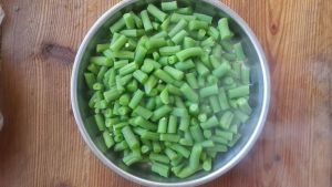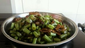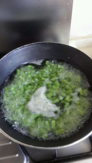 四季豆切段,这水中煮成8成熟。水中可以放点盐,这样味道会好一点。