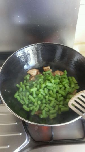 肉炒到差不多了就倒入煮好的四季豆,加入盐,少许的胡椒和鸡精,翻炒片刻。