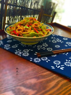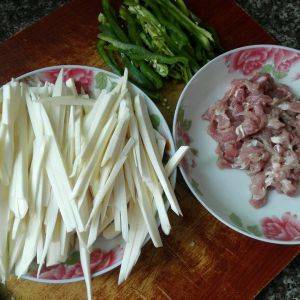 青椒、酱干切丝 肉也切成丝,然后倒一点生抽和黄酒/料酒去肉腥味