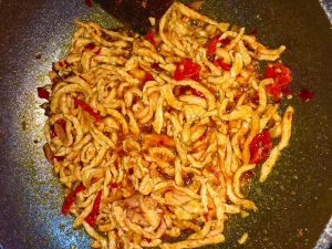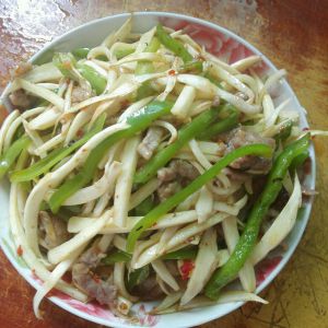 青椒入锅翻遍片刻,加入杏鲍菇继续翻遍,自由加入适量盐,水,加入肉丝继续翻炒