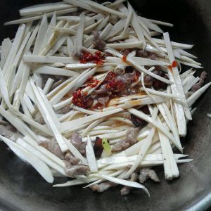 坐锅烧热下菜籽油烧辣下肉丝,豆瓣酱,泡椒,泡姜,将肉丝滑至变色