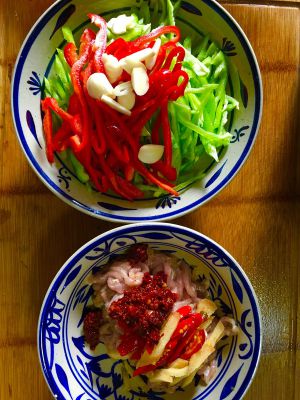 青椒,甜椒,切丝,蒜切片,里脊肉切肉丝,将腌肉调味料集中抓匀上浆,泡椒对半破开,泡姜切丝,豆瓣酱过磅备用。