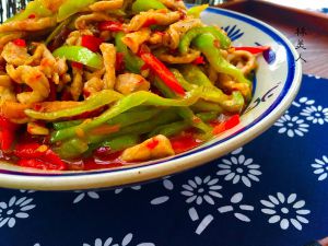 锅里放油,油辣以后,放拌好的猪肉炒,三分钟后,放入青椒一起炒,三分钟后放适量盐,味精,白糖起锅