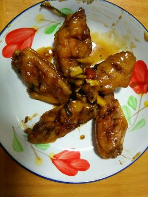 热锅烧热油,下姜片微微炸香,下葱花,中火鸡翅下锅翻炒,喷洒适量料酒。小火煎一下两面。倒入之前腌翅中的汁。