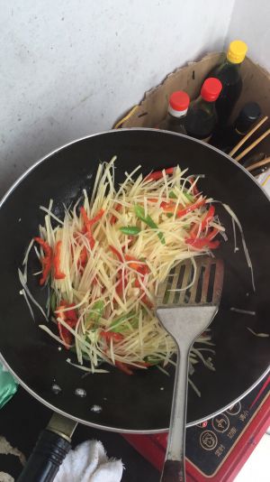 将葱干辣椒姜蒜爆锅后 放入花椒粉 放入土豆丝快速翻炒 边翻炒边放入盐 适量香醋 出锅