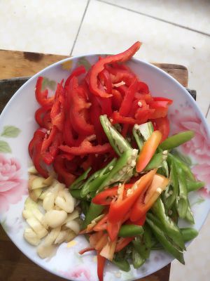 泡椒备好切丁,泡椒水留着备用,蒜瓣切碎。