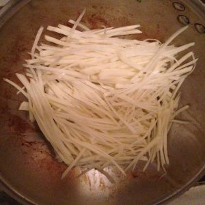 锅内烧水,水开放入土豆丝胡萝卜丝焯水一分钟。
