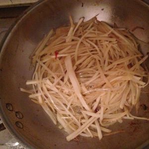 油锅烧热,入蒜末,醋椒碎爆香。入沥干的土豆丝翻炒均匀,加盐调味。如果土豆丝偏干,就加1勺料酒。翻炒至土豆丝变软
