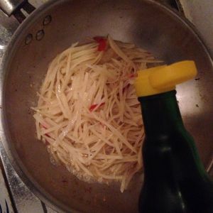 放入土豆丝和青椒丝,迅速放盐和醋翻炒半分钟左右