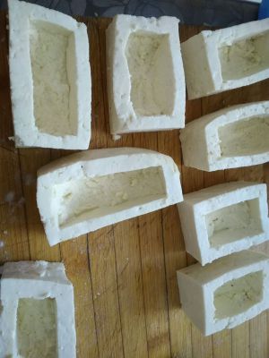 豆腐切块,中间挖洞备用。我这个切的有点难看