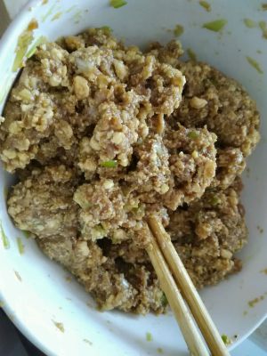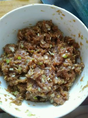 肉馅加入葱姜末、盐、酱油、香油等调料(同包子饺子陷)