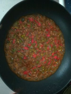 用煎豆腐的油,煸炒青红椒,放入三勺辣鲜露,水淀粉勾芡,加入适量香油
