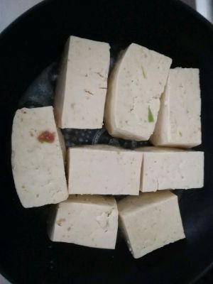 将煎好的豆腐放到锅中,加水,刚没过豆腐,小火焖煮