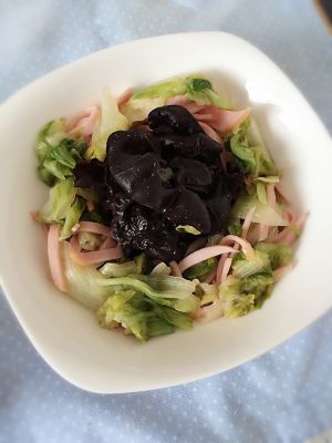 火腿切丝,丢锅里翻炒。软趴趴之后加入泡发木耳(一定要洗净并煮熟),继续翻炒。